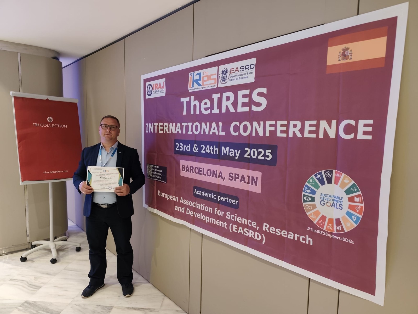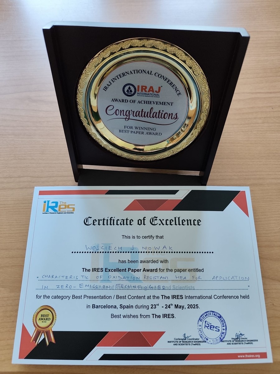 W dniu 24 maja 2025r. został wygłoszony wykład pt.: pt.: “Characteristic of Oxidation Resistant HEA for Application in Zero-Emission Technologies” autorstwa: Wojciech J. Nowak i Natalia Maciaszek podczas konferencji „IRES 2025: International Conferences of Mining, Metallurgy, and Materials Engineering” odbywającej się w dniach 23-24.05.2025 r. w Barcelonie, Hiszpania. Wykład oparty był na wynikach badań żaroodporności w atmosferze powietrza oraz powietrza z parą wodną uzyskanych w projekcie. Prelegent jednoznacznie wykazał ogromny potencjał jego nowatorskich stopów wysokiej entropii AlCoCrFeNi + x Nb do zastosowań w zeroemisyjnych technologiach wodorowych. Prelekcja wzbudziła mocne zainteresowanie ze strony słuchaczy i zaowocowała burzliwą i owocną dyskusją. Wykład jak również artykuł pokonferencyjny został doceniony i zdobył pierwszą nagrodę za najlepszy wykład konferencyjny i artykuł pokonferecyjny. Liczba słuchaczy ogółem: około 100.