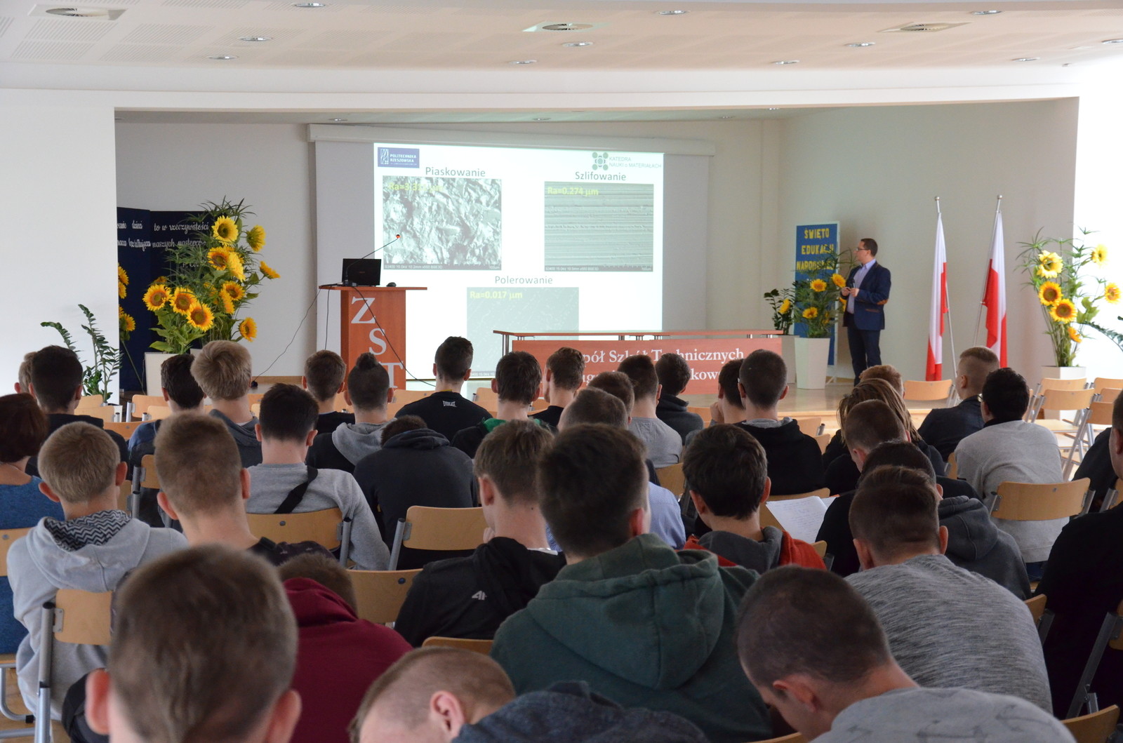 W dniu 20 X 2017 r. w Zespole Szkół Technicznych im. Eugeniusza Kwiatkowskiego w Rzeszowie odbył się wykład na temat gazowej korozji materiałów metalicznych. Referat wygłosił Pan dr inż. Wojciech Nowak z Katedry Nauki o Materiałach Politechniki Rzeszowskiej. Na wykładzie zostały przedstawione wyniki uzyskane w ramach projektu. Prezentacji wysłuchało łącznie około 120 uczniów.